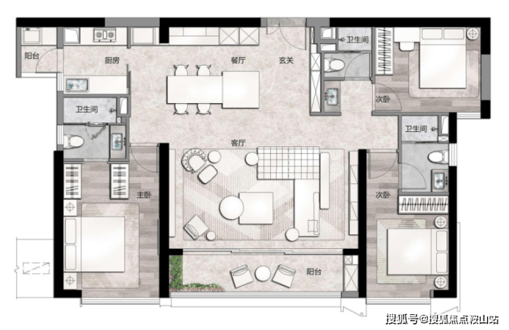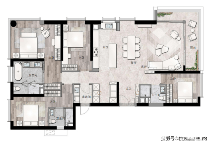 这是终极改善置业的首选。同样97%的得房率,四房三卫设计,完美满足多代同堂需求。