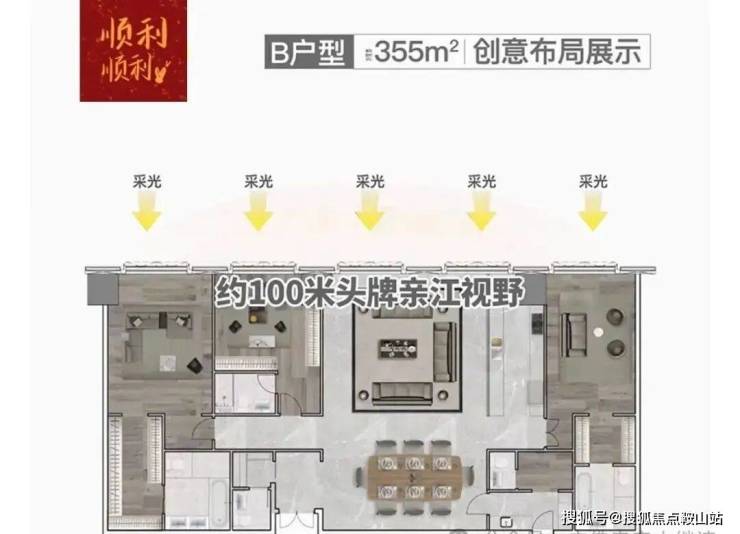 建面约355㎡户型,板式方正格局,一体化双厅,收揽一线江景与繁华。
