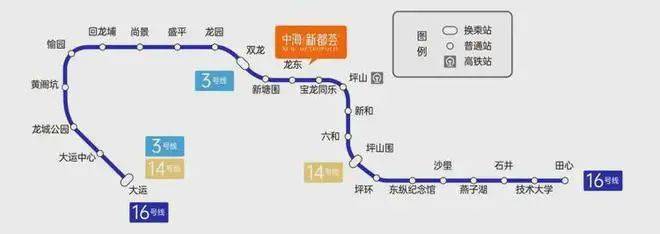地铁配套:中海新都荟,家门口就是16号地铁线“龙东站”,该线路是起自坪山田心,开往龙岗大运枢纽的普线,2站可到坪山高铁站,11站到大运站可换乘3/14号线。另外项目约500米是沈海高速同乐站出入口,串联南坪快速,水官高速,可快速通达深圳各大区域。