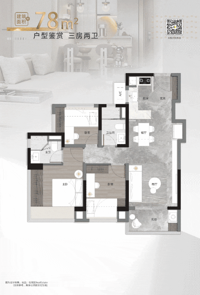 比如,建面约78㎡户型,虽然是起步级产品,依然做到3房2卫全功能设计。