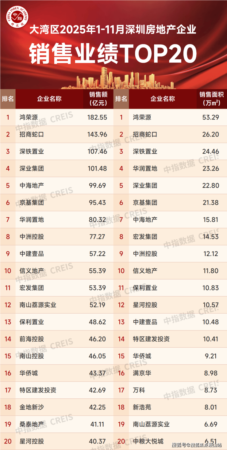 特别声明:房地产企业销售数据统计是以2025年1月1日—11月30日期间销售的商品房为统计口径,主要依据中指数据CREIS(点击查看)在深圳市(含深汕合作区)的销售监测数据,对于监测不全的项目数据,由企业提供相关文件并严格审核,也纳入统计范围。本报告仅供参考,我方不对使用报告及其内容所引发的任何直接或间接损失承担责任。