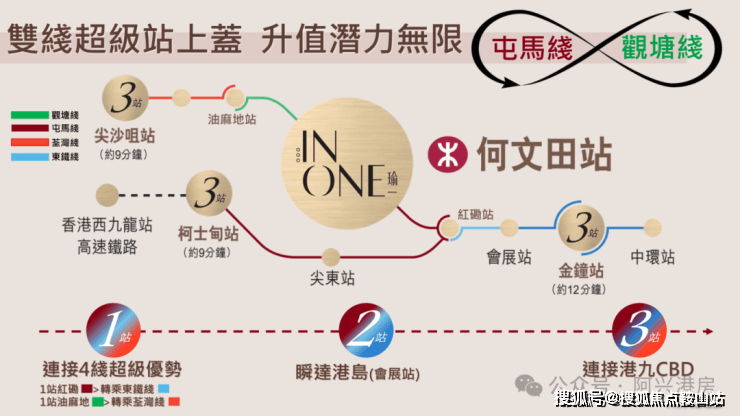 港铁双线交汇:何文田站为观塘线与屯马线交汇点,3站直达金钟(12分钟)、尖沙咀(9分钟)、柯士甸站(9分钟),无缝连接高铁西九龙站及红磡东铁线 半小时生活圈:驾车9分钟至港岛商业区,12分钟至尖沙咀,30分钟至香港国际机场。