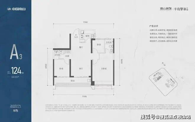 A3也是两条腿,分别是1-1栋04/05,主朝向是东南向,双龙抱珠格局。客厅拥有超大观景阳台,缺点是公卫是个暗卫,小次卧和主卫也对天井外走廊,采光不足。