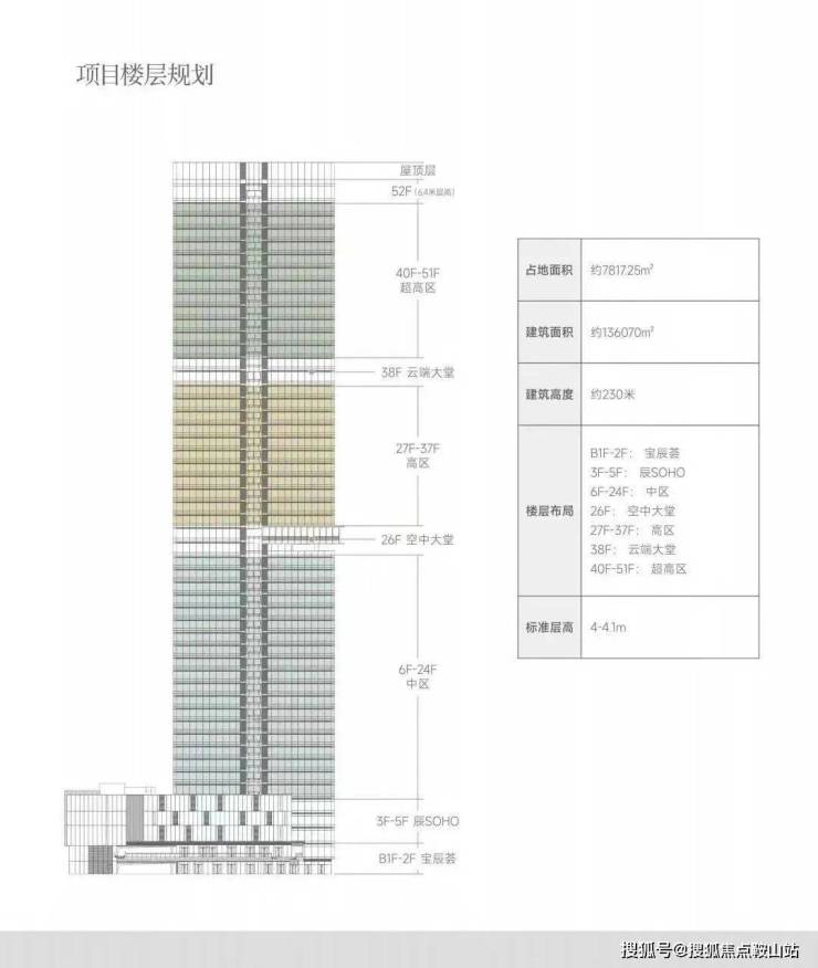 华侨城宝辰总高230米,为宝中最高楼;项目52层,分为中区、高区、超高区,6层起卖,11、39F为避难层,25-26F为空中会所,28F为空中大堂。除了空中大堂项目还有地下入库大堂+首层大堂,一共三重大堂。