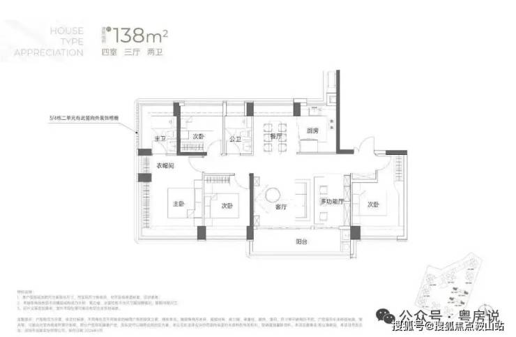 138㎡的4房2厅2卫:竖厅南北通透格局,专梯入户,客厅6.1米开间,LDKB一体化,全屋飘窗,4个卧室分别做到了3.9米/3.25米/2.9米/2.8米的宽度,主卧加1个次卧270°全景飘窗,客厅出6.1米长的大阳台,U型厨房,得房率约95-97%(包含赠送),阳台主朝西南向。138平米户型分布在3栋1单元、3栋2单元、4栋1单元、4栋2单,4个单元纯大户型。
