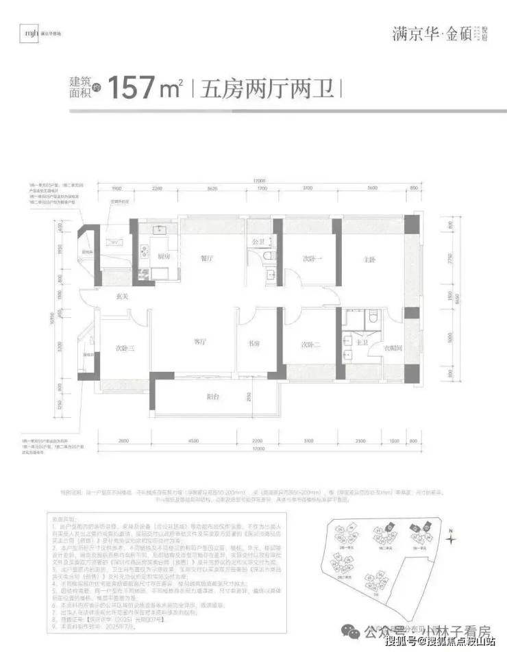 157㎡的5房2厅2卫,设计的是横厅南北通透格局,独门独户,客厅4.5米开间,四开间朝南,4房卧室分别做到了主卧27.44㎡/次卧11.97㎡/次卧11.24㎡/次卧11㎡/次卧8.36㎡(包含墙体飘窗),得房率79.6%(不加赠送),客厅连接次卧出6.7米长的观景大阳台,阳台主朝西北向看科学公园。赠送面积32.09㎡,加上赠送得房率100.84%。