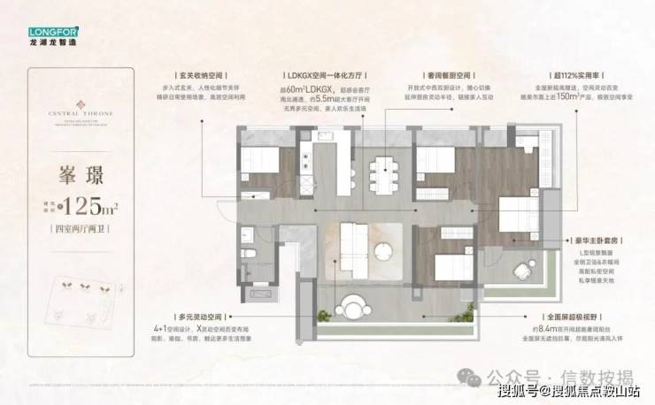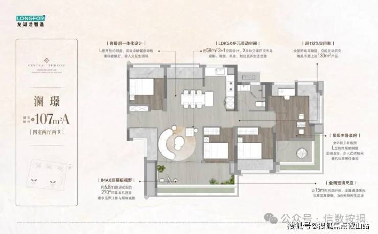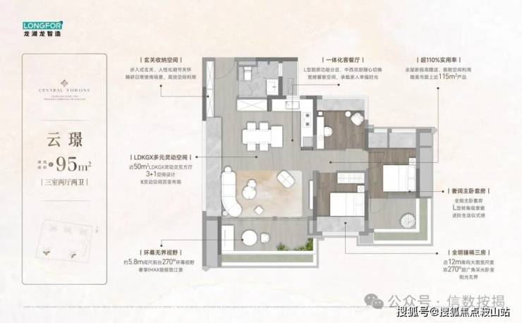对标市面115㎡,约5.8m超大阳台,5.8m超大客厅开间,近39㎡LDK谁,灵动布局,新潮实用,约5.4m约270°环幕观景窗。