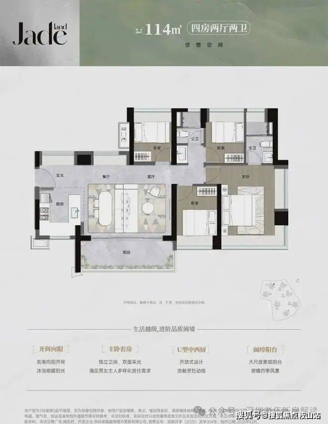 114平㎡的4房2厅2卫,设计的是横厅南北通透格局,进门入户玄关,LDKB一体化,五开间朝南,全屋9面飘窗,主卧大套间,U型厨房,卫生间干湿式分离,得房率约93.18%(包含赠送),阳台主朝东南向。