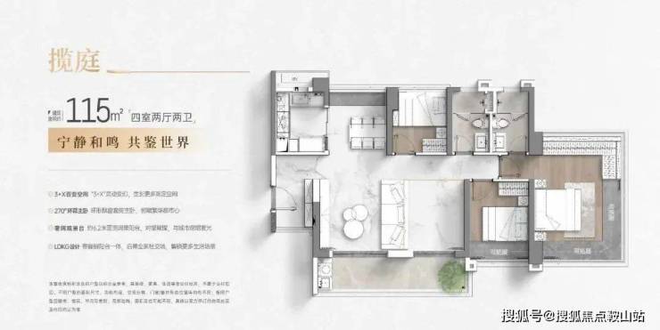 115㎡户型是最大的产品,四房两厅设计,其中一个空间是X,觉得客厅小了可以打掉,觉得房间不够用就保留。 阳台更亮眼,有6.2米面宽,视野更开阔;主套也是270°环形飘窗,整体格局都可以。
