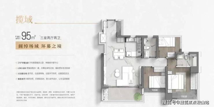 95㎡户型,也是三房两厅户型,南北对流,空间感会比86㎡更强,户型整体更为方正。 至于和市面上同面积段产品比,也算是各有亮点,比如未来方洲的95㎡,采用的是横厅设计,阳台尺度更大。
