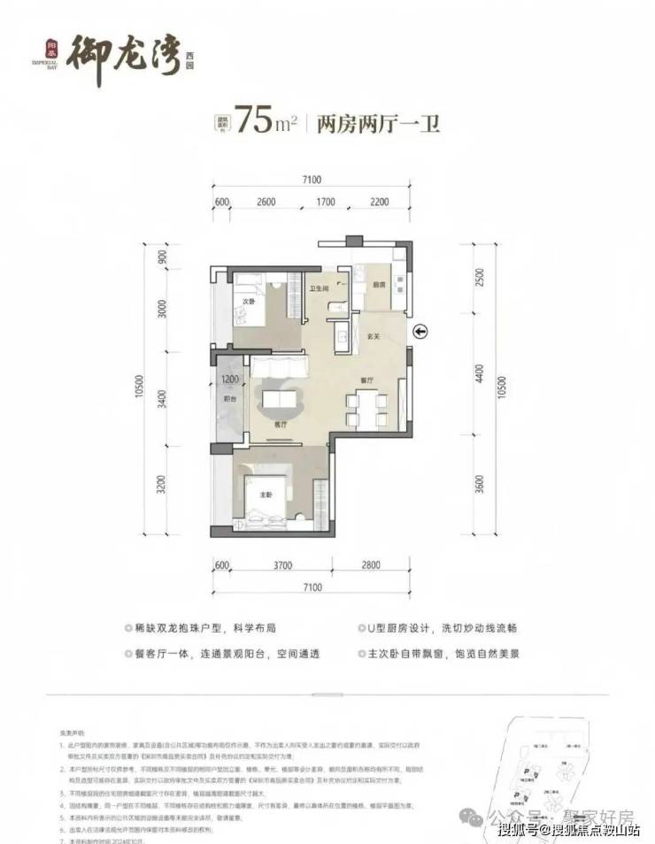 75㎡2房1卫,分布在1栋3/4单元01/08户型,设计的是竖厅稀缺的双龙抱珠格局,客厅开间3.4米,U型厨房,卫生间三段式分离设计,得房率约73.26%(不含赠送),东南或西北朝向,加上赠送得房率约80%