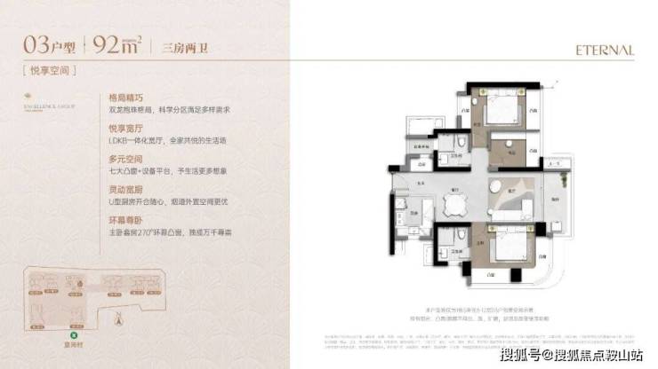 双龙抱珠格局,客餐厅一体化设计,全屋还是多靠飘窗赠送,U型厨房但是能跟客餐厅连为一体,主卧套房设计270°采光!