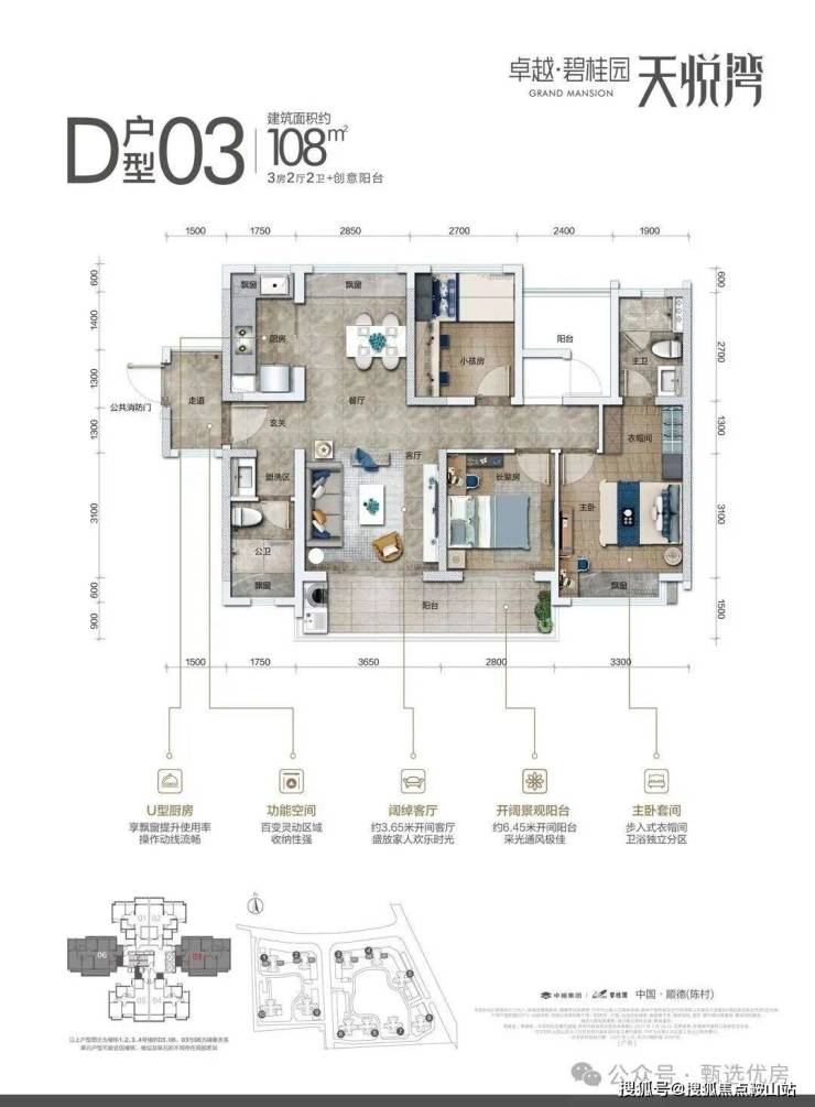 市面上的南北对流户型,一般在120㎡以上,而拥有超级阳台的又需要140㎡以上。而卓越·碧桂园·天悦湾108㎡就有四房,南北对流, 近7米的阳台横跨客厅、长辈房,绝对是广佛实用率超高及创新设计的优质户型!