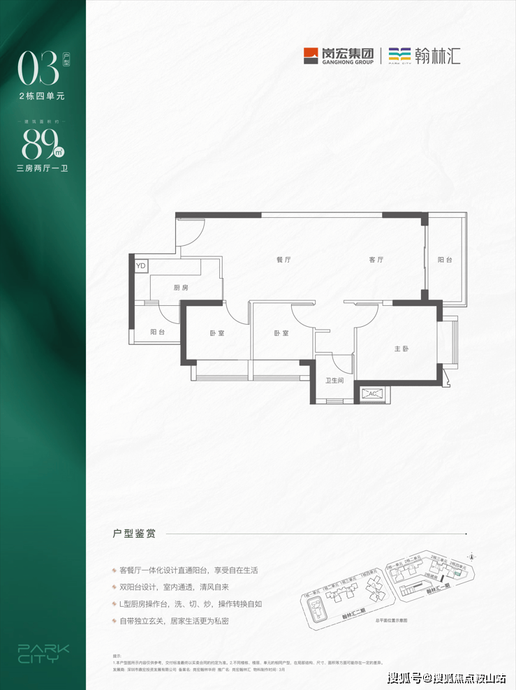 采用竖厅格局,客厅开间3.4米,实现LDKB一体化设计。L型厨房配备小生活阳台,卫生间采用三段式分离设计。得房率约71%(不含赠送部分),朝向为西南或东南。