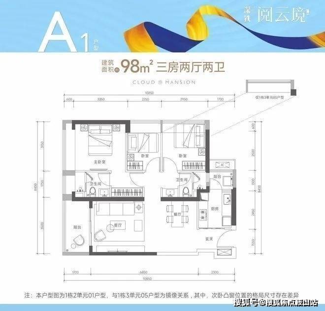 98㎡的3房2厅2卫(A1户型,1栋2单元01户型/1栋3单元05户型),设计的是竖厅格局,进门独立玄关,客厅3.5米开间,LDKB一体化设计,动静分区,3个卧室分别做到了3.15米/2.95米/2.25米的宽度,二字型厨房还带1个小生活阳台,得房率75-77%(不含赠送),阳台朝西向或东向。