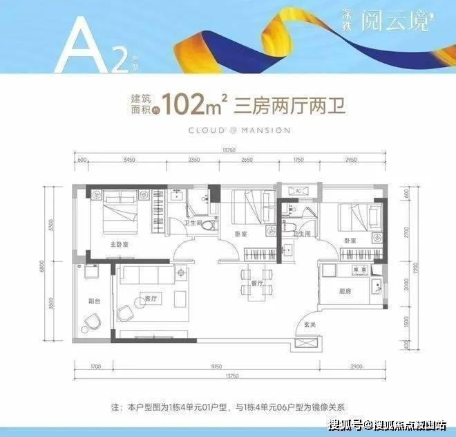 102㎡的3房2厅2卫(A2户型,1栋4单元01.06户型),设计的是竖厅格局,进门独立玄关,客厅3.5米开间,LDKB一体化设计,3个卧室分别做到了3.35米/2.95米/2.65米的宽度,L型厨房,公卫三段式分离,得房率75-77%(不含赠送),阳台朝西向或东向。
