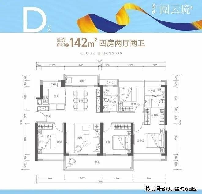 142㎡的4房2厅2卫,(D户型,1栋2单元05户型)设计的是竖厅南北通透格局,客厅4米开间,四开间朝南,双阳台设计,4个卧室分别做到了3.6米/3.3米/3米/2.8米的宽度,主卧大套房设计,客厅连接次卧出7.3米长的大阳台,U型厨房,得房率75-77%(不含赠送),大阳台主朝东南朝向。