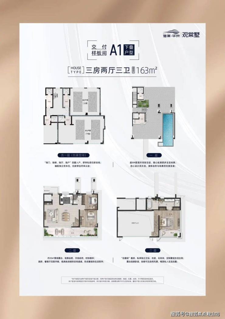 下叠建筑面积163㎡,3F2T3W,赠送209平米(含地下车库面积86平米,架空层庭院面积83平米,阳台30平米),共4层(负一层车库,首层,二楼,三楼),别墅地下车库以及首层层高3.9米,二楼三楼卧室层高3.3米,客厅挑高4.6米。