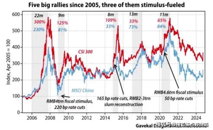 Gatley在周一的一份报告中分享了他的分析结果,这份研究报告是基于中国股市过去20年的表现。据他统计,自2005年沪深300指数推出以来,中国股市总共出现过五次“超级反弹”。在这五次令人瞩目的反弹中,只有两次(始于2006年和2017年)是由强劲的自身经济增长和企业利润上升推动的。其他三次都是由刺激措施推动的。
