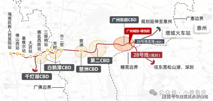 地铁28号线(已规划落实):从佛山西站出发,经新塘站,开往东莞、惠州。与广佛江珠城际、广深中轴城际贯通运营,1小时实现大湾区八大城市轨道交通的互联互通。