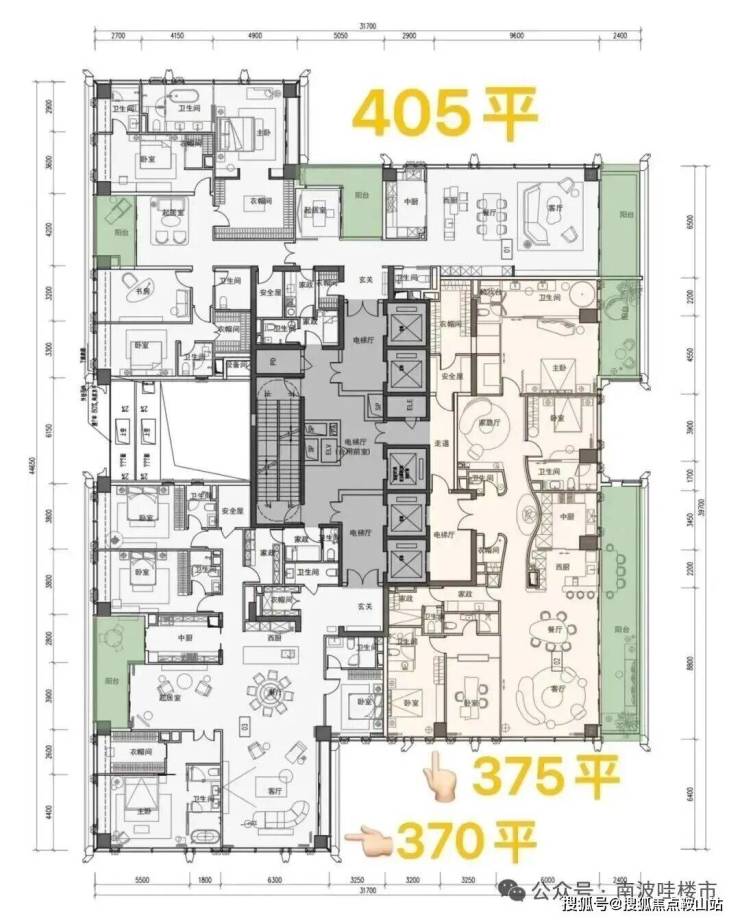 ——高区 42F起(150-200米)是约370-375-403㎡4+1房五卫+家庭厅+家政套间;