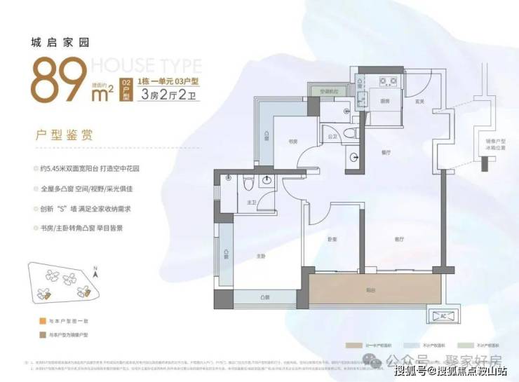 东南或西南朝向,竖厅设计,客厅有预留冰箱位,客厅,主卧,次卧分别朝南,户型一共有8个飘窗,加上阳台和飘窗使用率在90%左右。