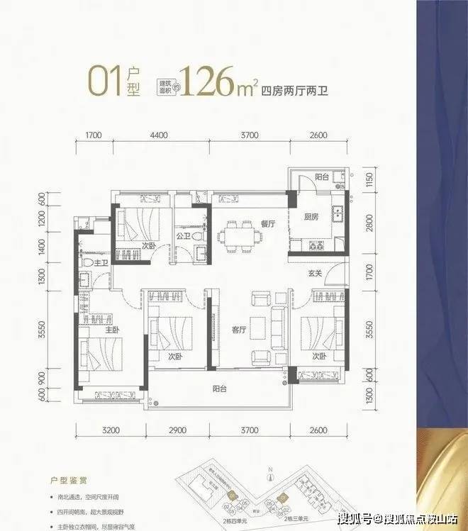 约126㎡的4房2卫: 该户型使用率高达约91%,南北通透,四开间朝南,配备约6.6米宽连廊式观景大阳台,畔山揽境,尽显雍容气度。