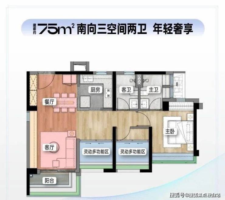 建面约82㎡三房两卫则是75㎡的等比放大plus版,每个功能区都在原75㎡基础上拥有更多空间,更适合预算更充足,想要更舒适产品的同学。