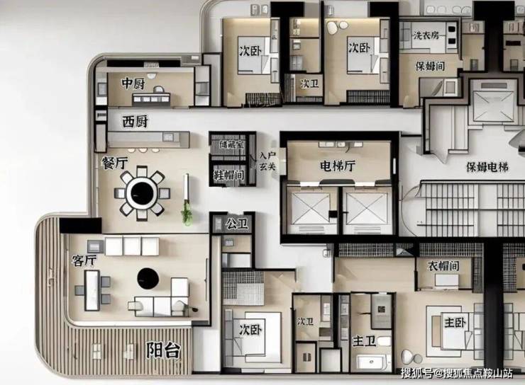 - 510㎡一层一户顶豪:3梯1户的专属配置,层高3.6米,5+1房3厅5卫的阔绰格局,搭配165.77米的地标高度(43层),将"私密性"与"仪式感"拉至顶点。这种"一户独占整层"的设计,不仅是空间的奢侈,更是圈层纯粹性的象征。