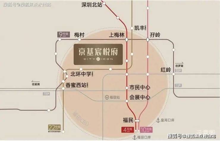 三轨交汇:地铁9号/4号/22号线(在建中)三轨交汇,直距约300米上梅林站;22号线开通后,直抵香蜜湖