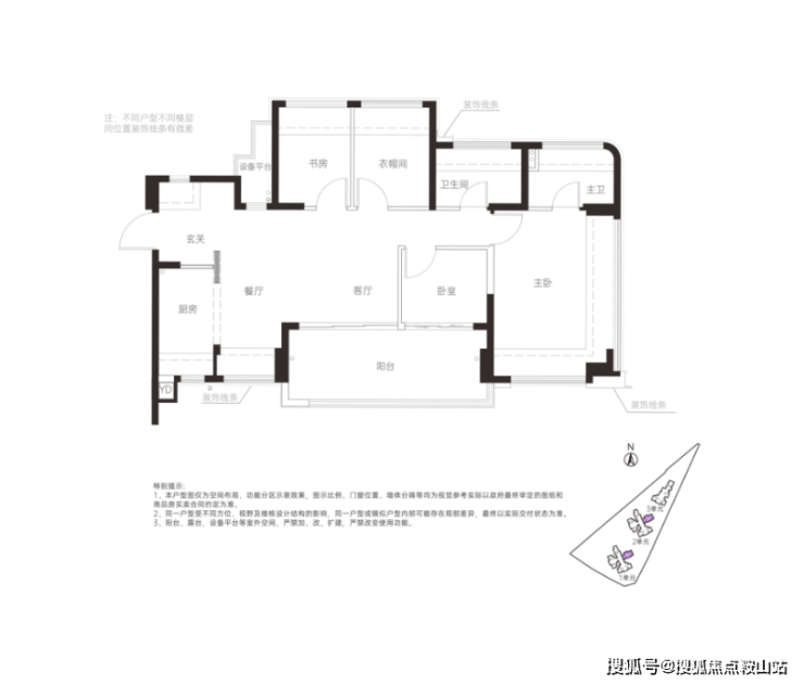 横厅设计,入户玄关处可以做收纳,全屋多飘窗,主卧套房设计,“阳台”和“书房”处实际可以做房间。