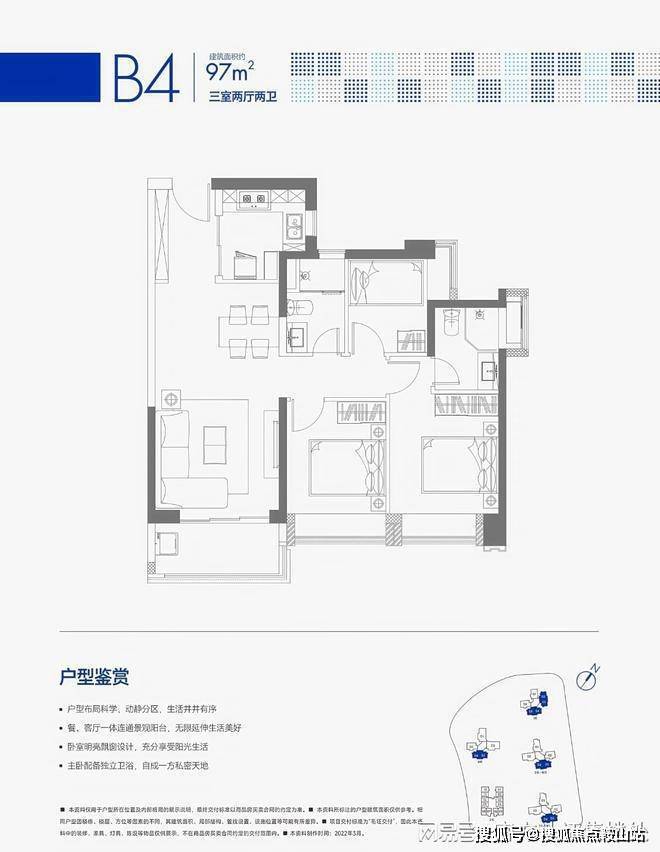 建面约99㎡3房是主力户型,朝向东北或东南方向,4栋朝向东南的远看高尔夫景观。