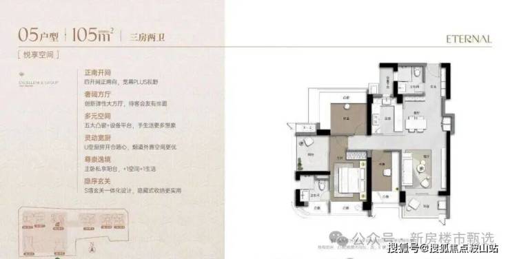 173m²的4房2厅3卫+家政间,设计的是竖厅类双龙抱珠格局,独立电梯厅入户约8.13㎡,客厅5.55米开间,LDKB一体化设计,主卧套房270°环幕凸窗+私享阳台,八大凸窗+设备平台+家政间,分别做到了主卧27.1㎡/次卧14.87㎡/次卧12.38㎡/次卧8.38㎡/家政间2.93㎡+阳台1.38㎡(实测面积,去掉墙体),U型厨房,公卫三段式干湿分离,得房率超90%(包含赠送),阳台9.56㎡正北朝向,看会展中心+市民广场。