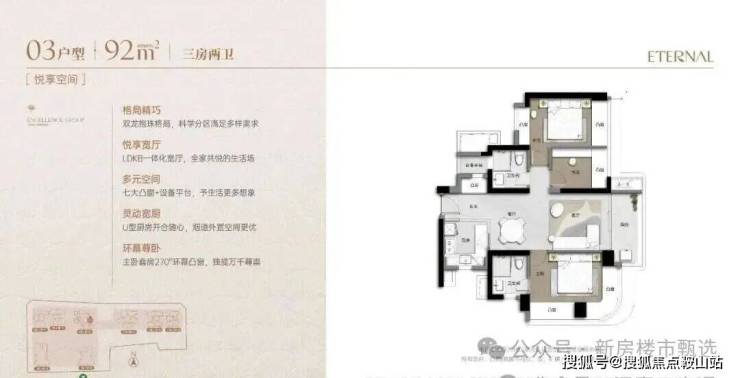 92m²的3房2厅2卫,设计的是双龙抱珠格局,客厅3.2米开间,LDKB一体化宽厅,主卧套房270°环幕凸窗,七大凸窗+设备平台,分别做到了主卧16.06㎡/次卧12.82㎡/次卧6㎡(实测面积,去掉墙体),U型厨房,卫生间干湿分离,得房率超90%(包含赠送),阳台实测6.54㎡正东朝向。