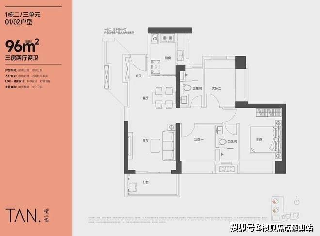 96㎡的3房2厅2卫,设计的是经典竖厅格局,LKDB一体化设计,进门入户玄关,动静分区,三开间朝南,有1个次卧做的双飘窗,U型厨房,得房率:74.34%(不含赠送),全部西南朝向。