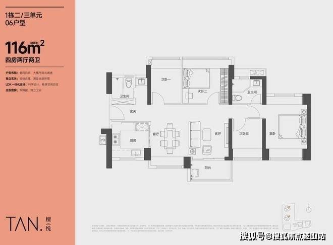 116㎡的4房2厅2卫,设计的是横厅南北通透格局,LKDB一体化设计,进门入户玄关,五开间朝南,超大宽面,主卧南北通设计,U型厨房,得房率:74.35%(不含赠送),阳台主朝东南向。