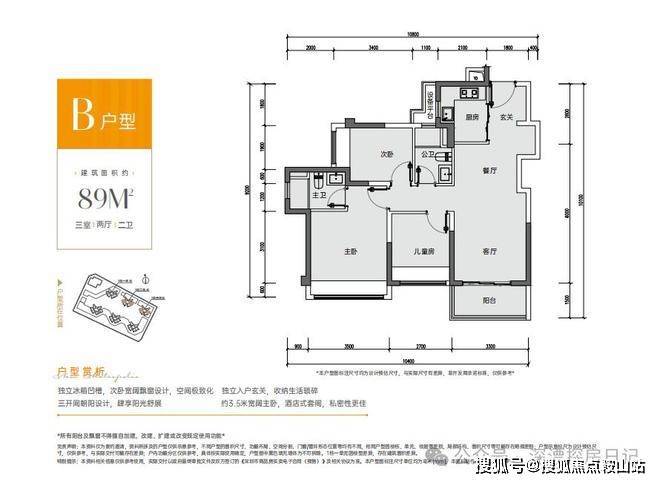 89㎡的3房2厅2卫,设计的是竖厅格局,客厅3.3米开间,S墙体设计预留双开门冰箱位,动静分区,三开间朝南,L型厨房,3个卧室的宽度分别为3.5/2.7/2.5米,得房率87.96-89.68%(包含赠送),阳台进深1.5米,朝西南或东南向。