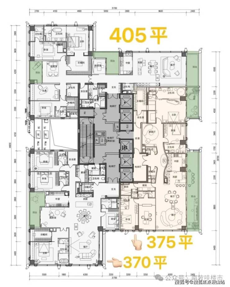 ——高区 42F起(150-200米)是约370-375-403㎡4+1房五卫+家庭厅+家政套间;