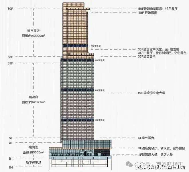 项目33-50F为瑞吉酒店,5-31F瑞湾府目前在售190-360㎡酒店式行政公馆,层高4.4米。