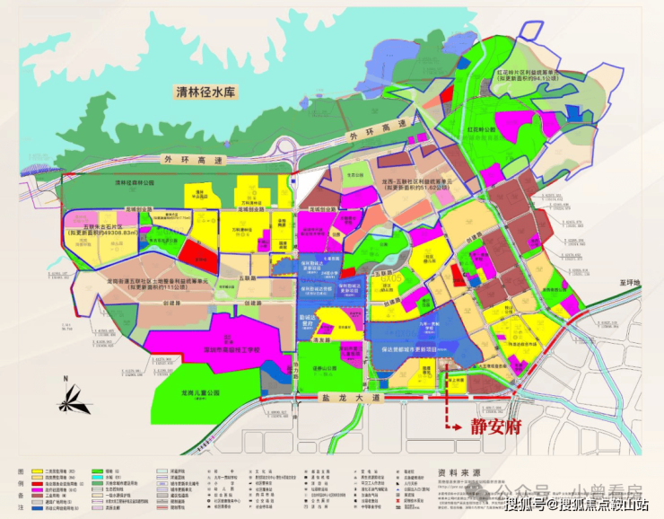 静安府于龙岗街道玉岭路与楼岭路(规划路)交界处。总建筑面积13.8万㎡,规划建设5栋住宅,总户数1050户其中商品房920户,保障房130户。套内面积≤90㎡共990户,占比约94%。小区配建一所1600㎡幼儿园。