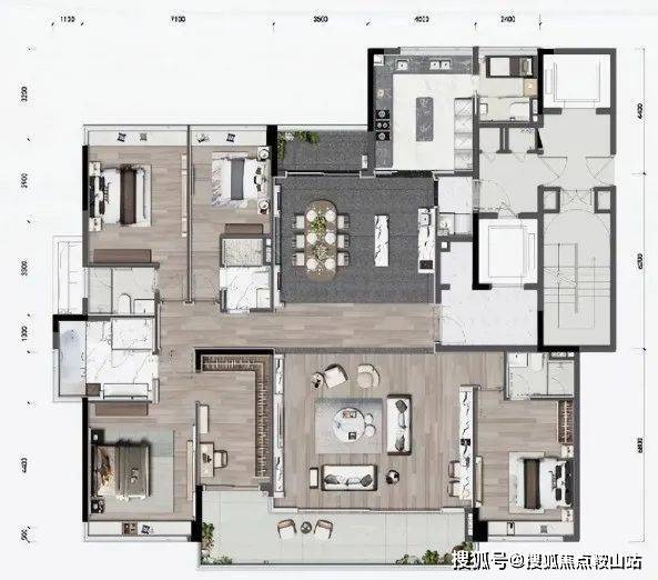 280平方米六房户型的四个休息房间均配备卫生间,电梯厅旁设有鞋房,中厨面积更大,甚至能放下岛台,客厅开间达7.6米。