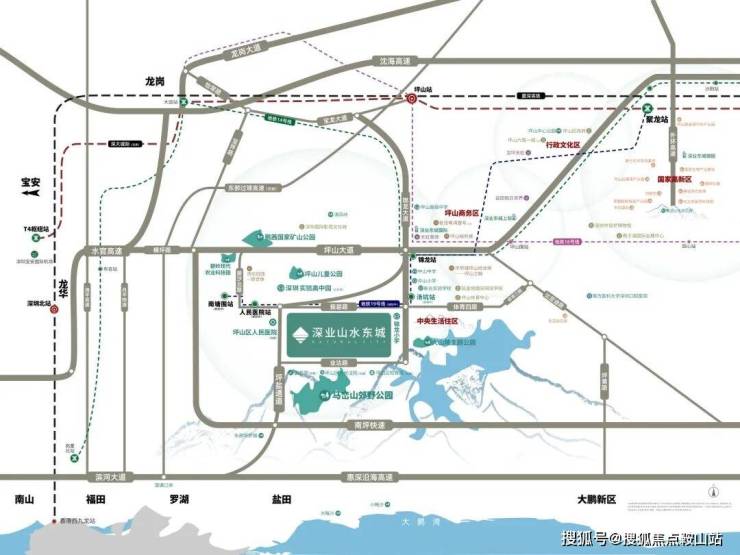 【山水东城】位于坪山区碧岭街道锦龙大道和振碧路交汇处西南角,从板块来说可以说是属于锦龙片区,属于比较南端的区域,南侧背靠马峦山脉,东侧邻近大山陂水库,西侧毗邻深实验学校高中园,还有坪山人民医院新院区。