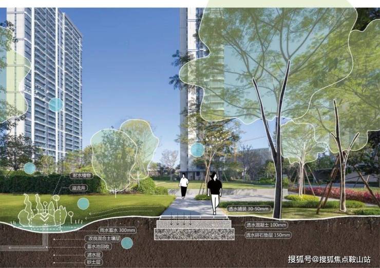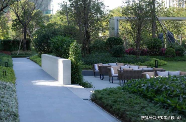 设计利用地形起伏,围绕景观水景建起涵盖林下休闲、户外会客、阳光草坪等多元化功能的城市客厅,结合节点处的葱茏绿植和随时间更迭的光影变化,构筑趋向于自然演绎的院落式生态场景。
