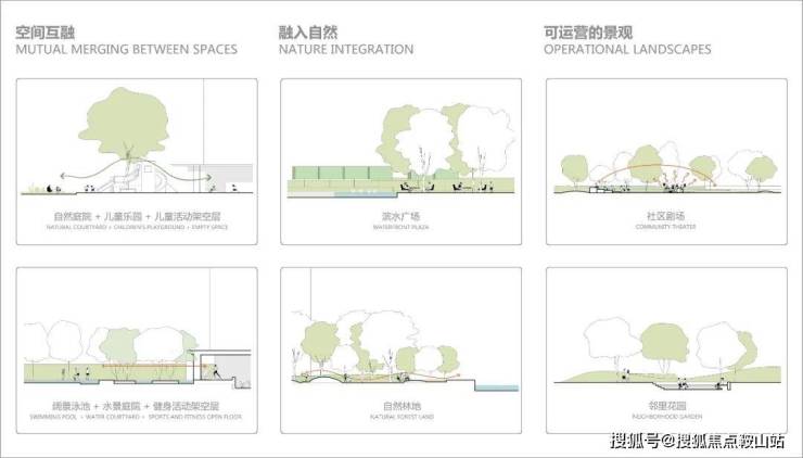 空间探索景观与自然的融合,通过与主园路相接的多处入口引导人们入园,蜿蜒的林地和起伏的丘陵地形,山、水、林、城元素浑然一体,空间可慢跑、健身、攀爬和躲藏,繁华与宁静的极致碰撞与结合,为居者提供舒适健康的生活方式。