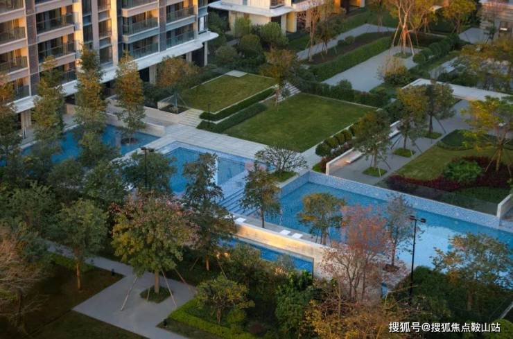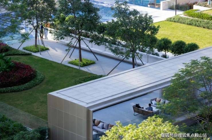 设计构筑水景交融的生态美,推演以人为主体的空间感知,以绿植、拓展草坪、艺术景墙围合空间,泳池被自然融入与包裹,最大限度地减少干扰、保证私密以及确保孩童在社区游玩的安全。