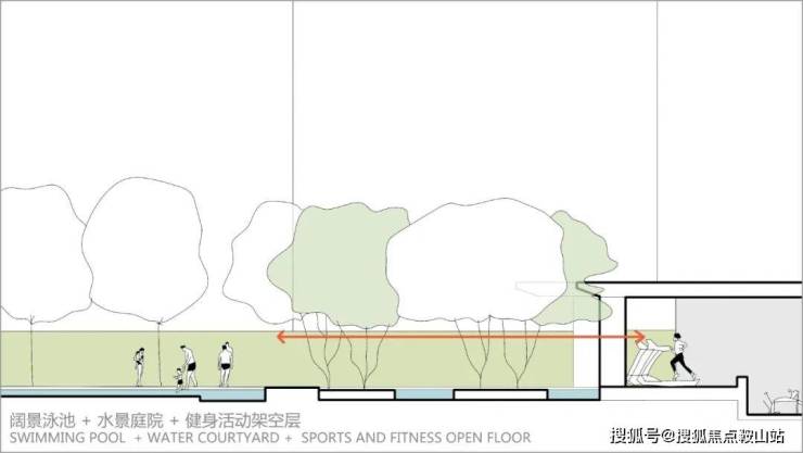 泳池室外功能板块与架空层功能联动互补,场地视野和流畅串联动线,让居者在以休闲运动的方式与自然亲密接触,营造诗意的社区运动空间。