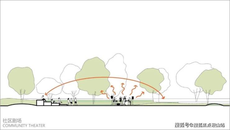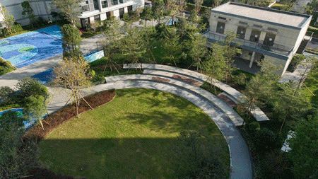 设计结合场地特征与实际需求,社区剧场与公共共享绿地相连,视野开阔,可拓展空间大。露天弧形剧场,提供公共集会的场所和社交空间,结合高差打造景观坐凳,材质运用可塑性高、自然朴素的生态竹木,坐在观景台上享受宁静的同时,可以欣赏到园区的美景。
