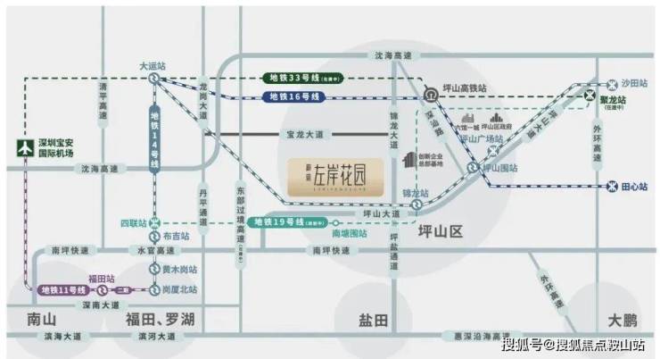 其中交通方面,地铁14号线:深圳东部首条地铁快线, 4站大运、12站福田岗厦北。地铁16号线:深圳东部组团线路,快速联通龙岗、坪山。地铁19号线(规划中):坪山首条区内地铁线,项目临近14/19号线换乘站锦龙站,南塘围站。