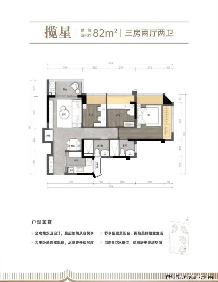 【建面约82㎡的三房两厅两卫】:竖厅三房,动静分区,S型冰箱位,阳台空间比较大,有差不多4.9个平方,主卧双飘窗,带独立卫生间;房间都很通透,采光也好,因为都带飘窗。