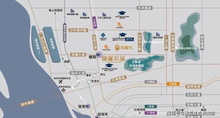 交通高效,距11 号线塘尾站约 300 米,步行 5 分钟可达,6 站宝中、7 站前海、11 站车公庙,快速串联南山、福田核心区;自驾紧邻宝安大道、凤塘大道,接驳沿江高速,通达全城。商业顶级,自带50 万㎡湾区壹方商业(壹方城升级版),周边万丰海岸城、山姆会员店、华强广场环绕,形成百亿级商圈。教育优质,家门口规划深外宝安学校南校区(幼儿园至高中),一站式名校资源,解决子女教育痛点。
